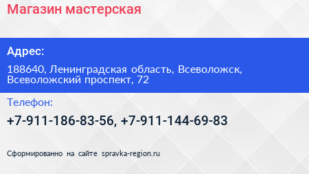Магазин-мастерская по адресу 188640, Ленинградская область, Всеволожск, Всеволожский проспект, 72 в дальнейшем Организация, размещена в следующих категориях: