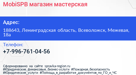 MobiSPB, магазин-мастерская по адресу 188643, Ленинградская область, Всеволожск, Межевая, 18а в дальнейшем Организация, размещена в следующих категориях: