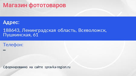 Магазин фототоваров по адресу 188643, Ленинградская область, Всеволожск, Пушкинская, 61 в дальнейшем Организация, размещена в следующих категориях:
