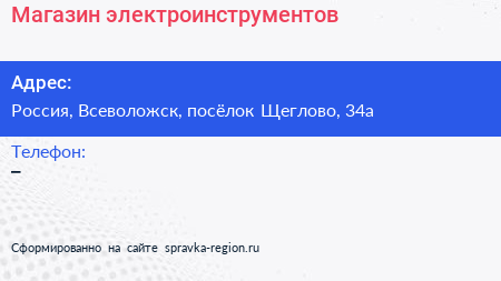 Магазин электроинструментов по адресу Коопхозунивермаг плюс, 34А, Щеглово, Щегловское сельское поселение, Всеволожский район, Ленинградская область, Северо-Западный федеральный округ, 188676, Россия в дальнейшем Организация, размещена в следующих категориях: