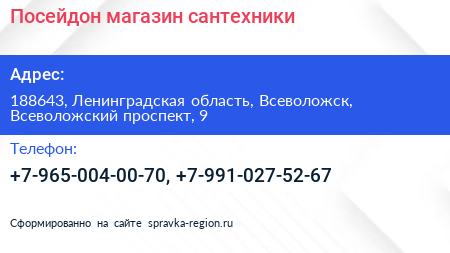Посейдон, магазин сантехники по адресу 188643, Ленинградская область, Всеволожск, Всеволожский проспект, 9 в дальнейшем Организация, размещена в следующих категориях: