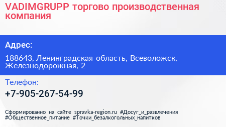VADIMGRUPP, торгово-производственная компания по адресу 188643, Ленинградская область, Всеволожск, Железнодорожная, 2 в дальнейшем Организация, размещена в следующих категориях: