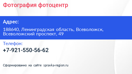 Фотография, фотоцентр по адресу 188640, Ленинградская область, Всеволожск, Всеволожский проспект, 49 в дальнейшем Организация, размещена в следующих категориях: