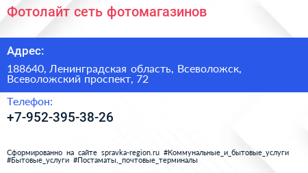 Фотолайт, сеть фотомагазинов по адресу 188640, Ленинградская область, Всеволожск, Всеволожский проспект, 72 в дальнейшем Организация, размещена в следующих категориях: