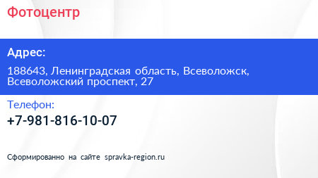 Фотоцентр по адресу 188643, Ленинградская область, Всеволожск, Всеволожский проспект, 27 в дальнейшем Организация, размещена в следующих категориях: