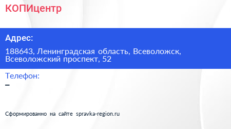 КОПИцентр по адресу 188643, Ленинградская область, Всеволожск, Всеволожский проспект, 52 в дальнейшем Организация, размещена в следующих категориях: