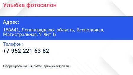 Улыбка, фотосалон по адресу 188641, Ленинградская область, Всеволожск, Магистральная, 9 лит Б в дальнейшем Организация, размещена в следующих категориях: