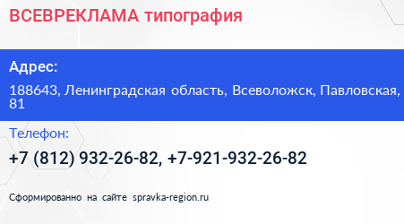 ВСЕВРЕКЛАМА, типография по адресу 188643, Ленинградская область, Всеволожск, Павловская, 81 в дальнейшем Организация, размещена в следующих категориях: