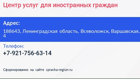 Центр услуг для иностранных граждан по адресу 188643, Ленинградская область, Всеволожск, Варшавская, 4 в дальнейшем Организация, размещена в следующих категориях: