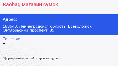 Baobag, магазин сумок по адресу 188643, Ленинградская область, Всеволожск, Октябрьский проспект, 85 в дальнейшем Организация, размещена в следующих категориях:
