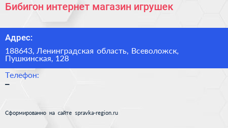 Бибигон, интернет-магазин игрушек по адресу 188643, Ленинградская область, Всеволожск, Пушкинская, 128 в дальнейшем Организация, размещена в следующих категориях: