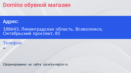 Domino, обувной магазин по адресу 188643, Ленинградская область, Всеволожск, Октябрьский проспект, 85 в дальнейшем Организация, размещена в следующих категориях:
