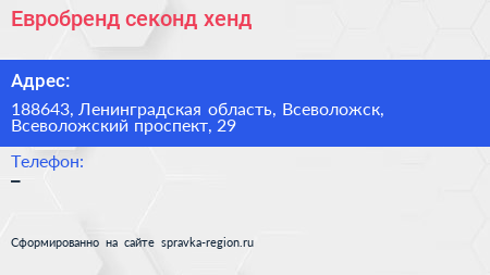Евробренд, секонд-хенд по адресу 188643, Ленинградская область, Всеволожск, Всеволожский проспект, 29 в дальнейшем Организация, размещена в следующих категориях: