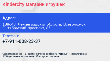 Kindercity, магазин игрушек по адресу 188643, Ленинградская область, Всеволожск, Октябрьский проспект, 85 в дальнейшем Организация, размещена в следующих категориях: