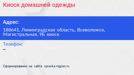 Киоск домашней одежды по адресу 188641, Ленинградская область, Всеволожск, Магистральная, 9Б киоск в дальнейшем Организация, размещена в следующих категориях: