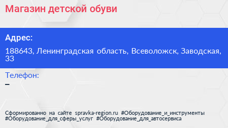 Магазин детской обуви по адресу 188643, Ленинградская область, Всеволожск, Заводская, 33 в дальнейшем Организация, размещена в следующих категориях: