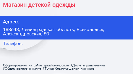 Магазин детской одежды по адресу 188643, Ленинградская область, Всеволожск, Александровская, 80 в дальнейшем Организация, размещена в следующих категориях:
