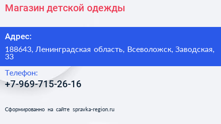 Магазин детской одежды по адресу 188643, Ленинградская область, Всеволожск, Заводская, 33 в дальнейшем Организация, размещена в следующих категориях: