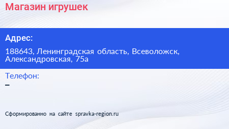 Магазин игрушек по адресу 188643, Ленинградская область, Всеволожск, Александровская, 75а в дальнейшем Организация, размещена в следующих категориях: