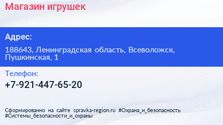Магазин игрушек по адресу 188643, Ленинградская область, Всеволожск, Пушкинская, 1 в дальнейшем Организация, размещена в следующих категориях: