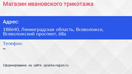 Магазин ивановского трикотажа по адресу 188640, Ленинградская область, Всеволожск, Всеволожский проспект, 68а в дальнейшем Организация, размещена в следующих категориях: