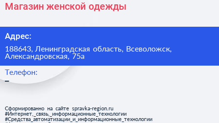 Магазин женской одежды по адресу 188643, Ленинградская область, Всеволожск, Александровская, 75а в дальнейшем Организация, размещена в следующих категориях: