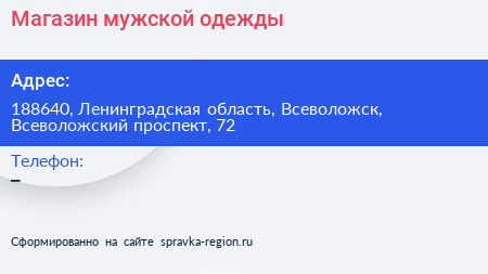 Магазин мужской одежды по адресу 188640, Ленинградская область, Всеволожск, Всеволожский проспект, 72 в дальнейшем Организация, размещена в следующих категориях: