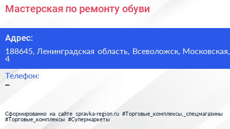 Мастерская по ремонту обуви по адресу 188645, Ленинградская область, Всеволожск, Московская, 4 в дальнейшем Организация, размещена в следующих категориях: