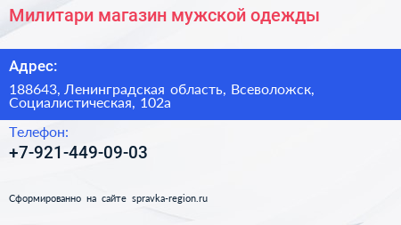 Милитари, магазин мужской одежды по адресу 188643, Ленинградская область, Всеволожск, Социалистическая, 102а в дальнейшем Организация, размещена в следующих категориях: