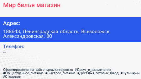 Мир белья, магазин по адресу 188643, Ленинградская область, Всеволожск, Александровская, 80 в дальнейшем Организация, размещена в следующих категориях:
