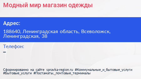 Модный мир, магазин одежды по адресу 188640, Ленинградская область, Всеволожск, Ленинградская, 38 в дальнейшем Организация, размещена в следующих категориях: