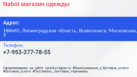 Nabot, магазин одежды по адресу 188645, Ленинградская область, Всеволожск, Московская, 9 в дальнейшем Организация, размещена в следующих категориях:
