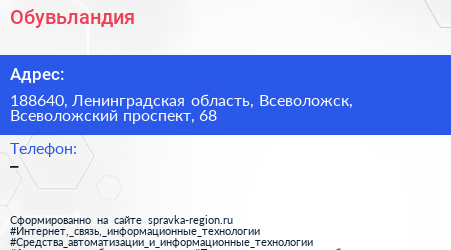 Обувьландия по адресу 188640, Ленинградская область, Всеволожск, Всеволожский проспект, 68 в дальнейшем Организация, размещена в следующих категориях: