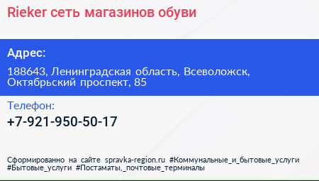 Rieker, сеть магазинов обуви по адресу 188643, Ленинградская область, Всеволожск, Октябрьский проспект, 85 в дальнейшем Организация, размещена в следующих категориях: