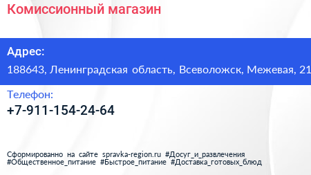 Комиссионный магазин по адресу 188643, Ленинградская область, Всеволожск, Межевая, 21 в дальнейшем Организация, размещена в следующих категориях: