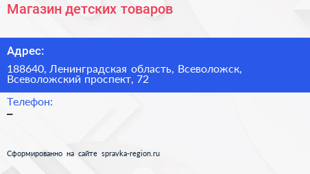 Магазин детских товаров по адресу 188640, Ленинградская область, Всеволожск, Всеволожский проспект, 72 в дальнейшем Организация, размещена в следующих категориях: