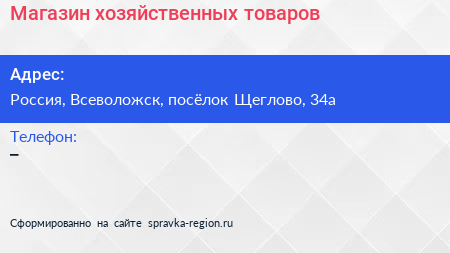 Магазин хозяйственных товаров по адресу Коопхозунивермаг плюс, 34А, Щеглово, Щегловское сельское поселение, Всеволожский район, Ленинградская область, Северо-Западный федеральный округ, 188676, Россия в дальнейшем Организация, размещена в следующих категориях: