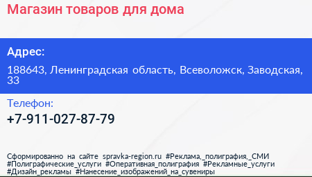 Магазин товаров для дома по адресу 188643, Ленинградская область, Всеволожск, Заводская, 33 в дальнейшем Организация, размещена в следующих категориях: