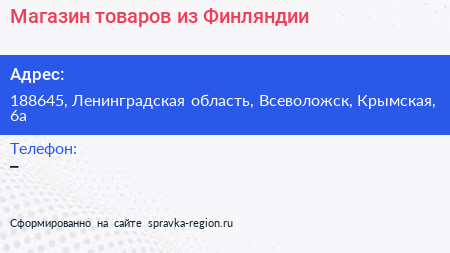Магазин товаров из Финляндии по адресу 188645, Ленинградская область, Всеволожск, Крымская, 6а в дальнейшем Организация, размещена в следующих категориях: