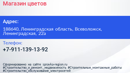 Магазин цветов по адресу 188640, Ленинградская область, Всеволожск, Ленинградская, 22а в дальнейшем Организация, размещена в следующих категориях: