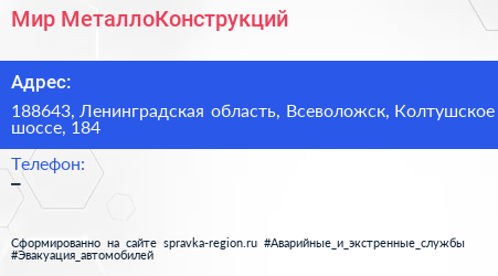Мир МеталлоКонструкций по адресу 188643, Ленинградская область, Всеволожск, Колтушское шоссе, 184 в дальнейшем Организация, размещена в следующих категориях:
