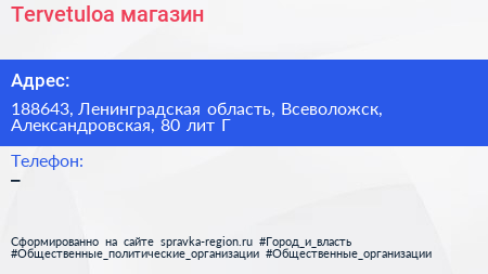 Tervetuloa, магазин по адресу 188643, Ленинградская область, Всеволожск, Александровская, 80 лит Г в дальнейшем Организация, размещена в следующих категориях: