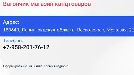 Вагончик, магазин канцтоваров по адресу 188643, Ленинградская область, Всеволожск, Межевая, 21 в дальнейшем Организация, размещена в следующих категориях: