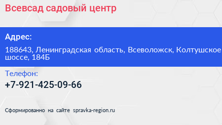 Всевсад, садовый центр по адресу 188643, Ленинградская область, Всеволожск, Колтушское шоссе, 184Б в дальнейшем Организация, размещена в следующих категориях: