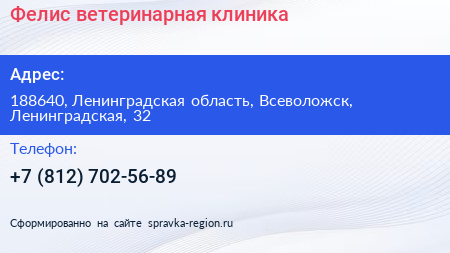Фелис, ветеринарная клиника по адресу 188640, Ленинградская область, Всеволожск, Ленинградская, 32 в дальнейшем Организация, размещена в следующих категориях: