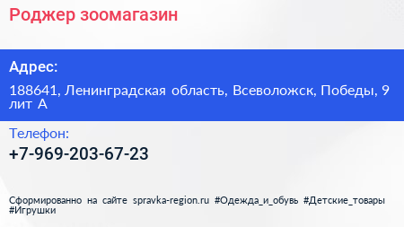 Роджер, зоомагазин по адресу 188641, Ленинградская область, Всеволожск, Победы, 9 лит А в дальнейшем Организация, размещена в следующих категориях: