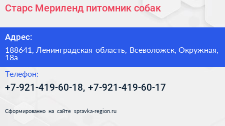 Старс Мериленд, питомник собак по адресу 188641, Ленинградская область, Всеволожск, Окружная, 18а в дальнейшем Организация, размещена в следующих категориях: