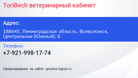 ToriBech, ветеринарный кабинет по адресу 188645, Ленинградская область, Всеволожск, Центральная (Южный), 8 в дальнейшем Организация, размещена в следующих категориях: