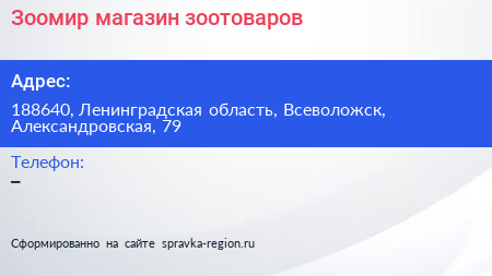 Зоомир, магазин зоотоваров по адресу 188640, Ленинградская область, Всеволожск, Александровская, 79 в дальнейшем Организация, размещена в следующих категориях: