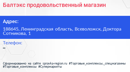 Балтэкс, продовольственный магазин по адресу 188645, Ленинградская область, Всеволожск, Доктора Сотникова, 1 в дальнейшем Организация, размещена в следующих категориях: